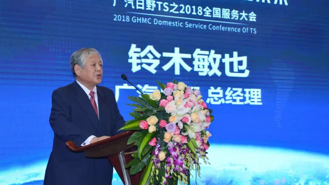 广汽日野总经理铃木敏也先生致辞,代表广汽日野对所有嘉宾的到来表示热烈的欢迎,TS活动的精髓在于通过把握客户需求、提供售前&售中&售后等一系列服务让客户放心、舒心,此次TS服务大会开展,正是广汽日野全面落实TS活动的一个缩影,通过全方位、多层次的活动开展,与各特约店齐心协力,共同助力客户事业健康、快速、可持续发展。
