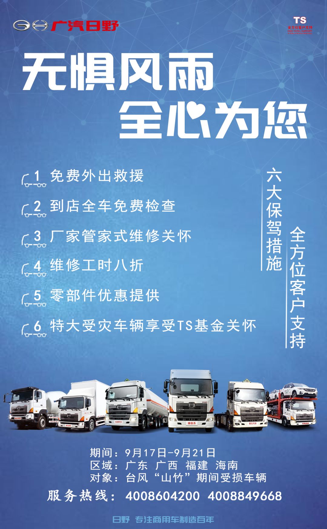 现场,广汽日野针对近日台风“山竹”灾情,在9月17日—9月21日期间,推出“无惧风雨 全心为您”的服务活动,为各位客户保驾护航!